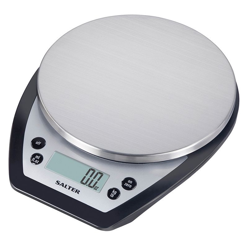 Bake better with the accurate measuring features of this Salter stainless steel digital kitchen scale