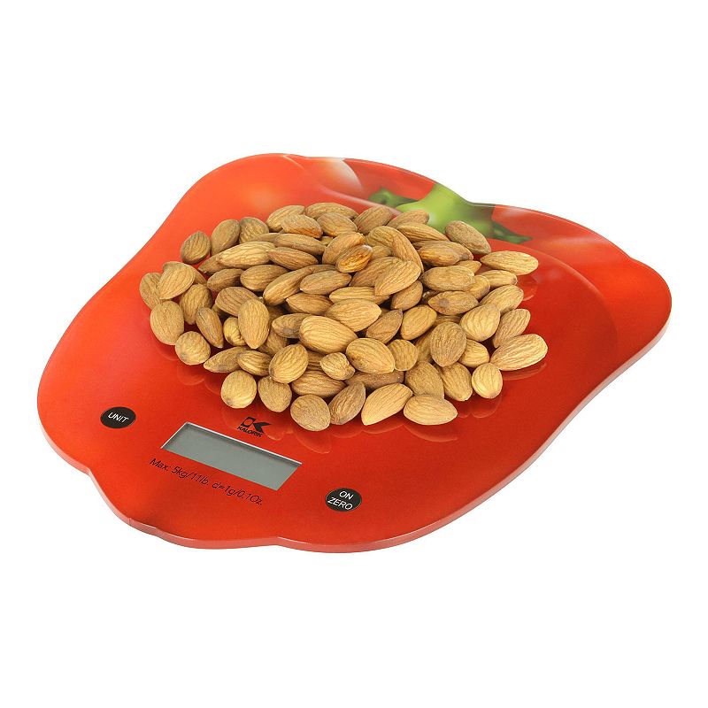 This Kalorik red pepper digital kitchen scale makes a fun addition to your kitchen